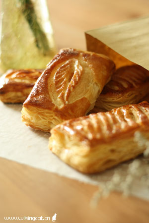 菠萝派:派皮同国王派.不同的是,把派皮切成长条,中间填上像做菠萝酱一样做的菠萝粒,刷上蛋液后覆盖.表面处理同国王派.剩下的边料.做了迷你蝴蝶酥.