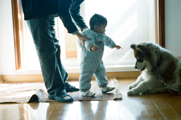 当他要咬爸爸时,爸爸把毛腿一露,小七喜便摇头转身了。