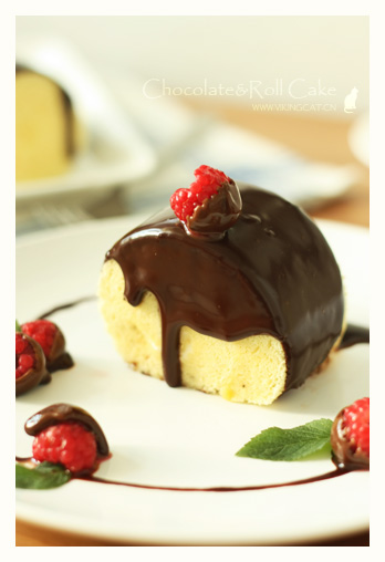 把巧克力淋在喜爱的蛋糕卷上面