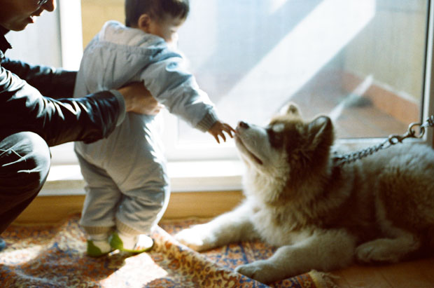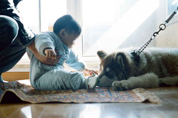 当他要咬爸爸时,爸爸把毛腿一露,小七喜便摇头转身了。